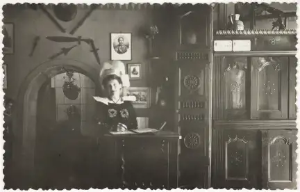 Compléments sur cette image. Dans les collections : http://www.collections.musee-bretagne.fr/ark:/83011/FLMjo246197. Cette photographie a été prise quand les sœurs Marguerite et Elise Le Coz géraient le Ti-Koz. Leur restaurant est étoilé au Michelin de 1962 à la fin des années 1970. Elles reçoivent même une deuxième étoile en 1967 pour leur ris de veau Ti-Koz, leur homard et leurs crêpes flambées au marasquin.